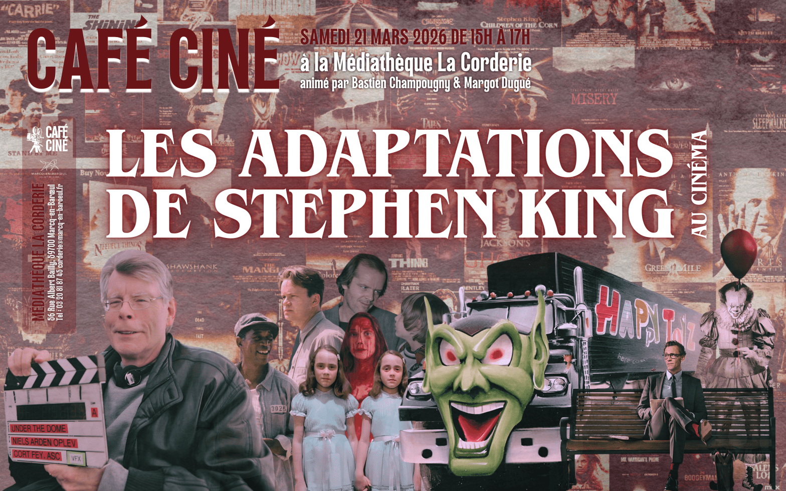 À l’aide de quiz, d’extraits, de débats et de quelques litres de faux sang (numérique), nous vous invitons à plonger dans les coulisses du cinéma « à la Stephen King ». Un cinéma fascinant où se rencontrent les plus grands tels que De Palma, Kubrick, Darabont, Carpenter, Cronenberg…